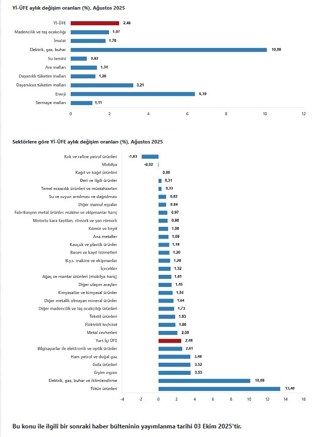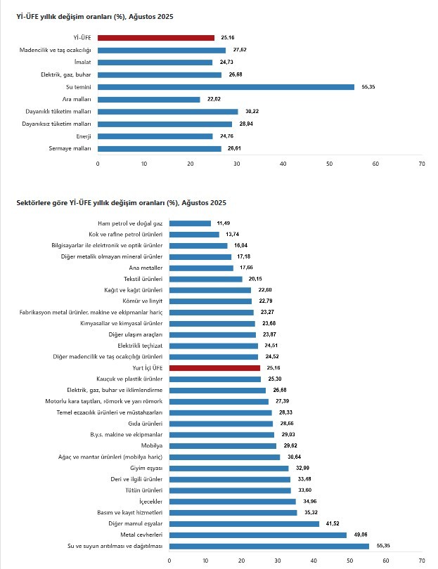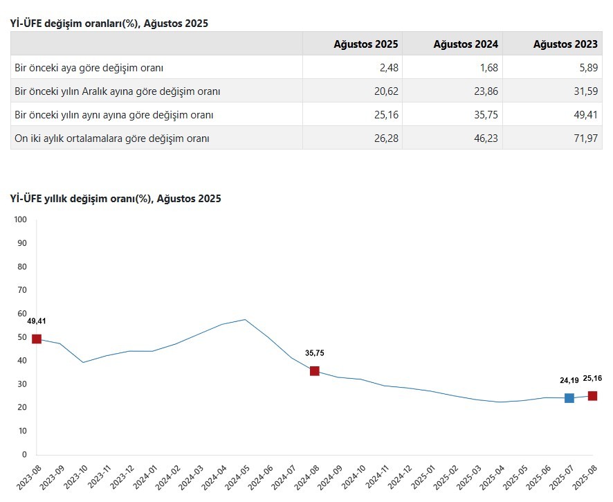 Yİ-ÜFE (2003=100) 2025 yılı Ağustos ayında bir önceki aya göre %2,48 artış, bir önceki yılın Aralık ayına göre %20,62 artış, bir önceki yılın aynı ayına göre %25,16 artış ve on iki aylık ortalamalara göre %26,28 artış gösterdi.