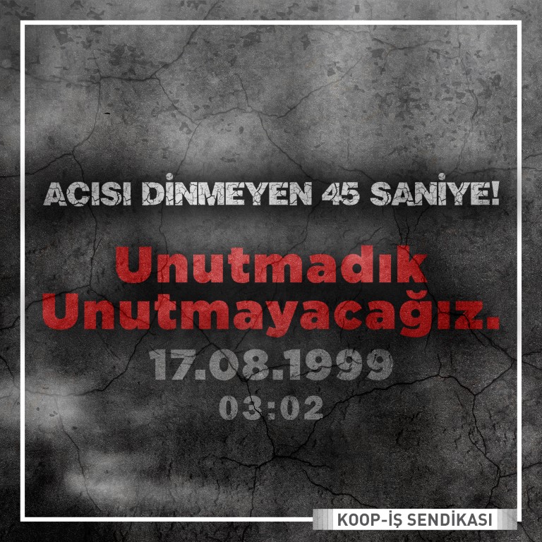 Böyle bir acının ülkemizde ve dünyada bir daha yaşanmamasını temenni ediyor, 17 Ağustos'ta ve ve hemen ardından 12 Kasım'da (Düzce Depremi) yaşanan depremde kaybettiğimiz üyelerimiz Fatma Emanet, Sacide Hergül, Kenan Eryıldırım, Coşkun Dündar, Ahmet Atik, Hikmet Yılmaz'ı ve tüm yurttaşlarımızı saygı ve rahmetle anıyoruz.