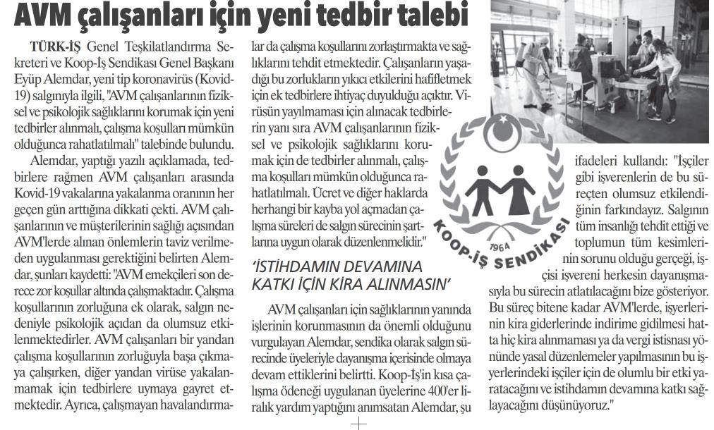 TÜRK-İŞ Genel Teşkilatlandırma Sekreteri ve Sendikamız Genel Başkanı Eyüp Alemdar, yaptığı açıklamayla Covid-19 salgının sürdüğünü, AVM’lerde salgına karşı önlemlerin artırılmasını istedi. Alemdar, AVM’lerde alınacak tedbirlerin arttırılmasının yanı sıra, AVM çalışanlarının çalışma koşullarını kolaylaştıracak, fiziksel ve psikolojik sağlıklarını koruyacak tedbirlerin alınması gerektiğini kaydetti. Alemdar'ın açıklaması basında geniş yer buldu.