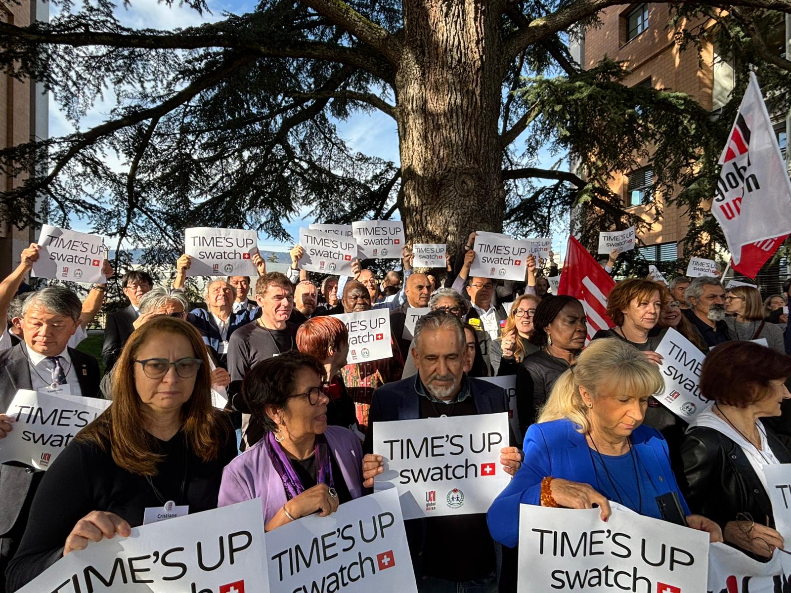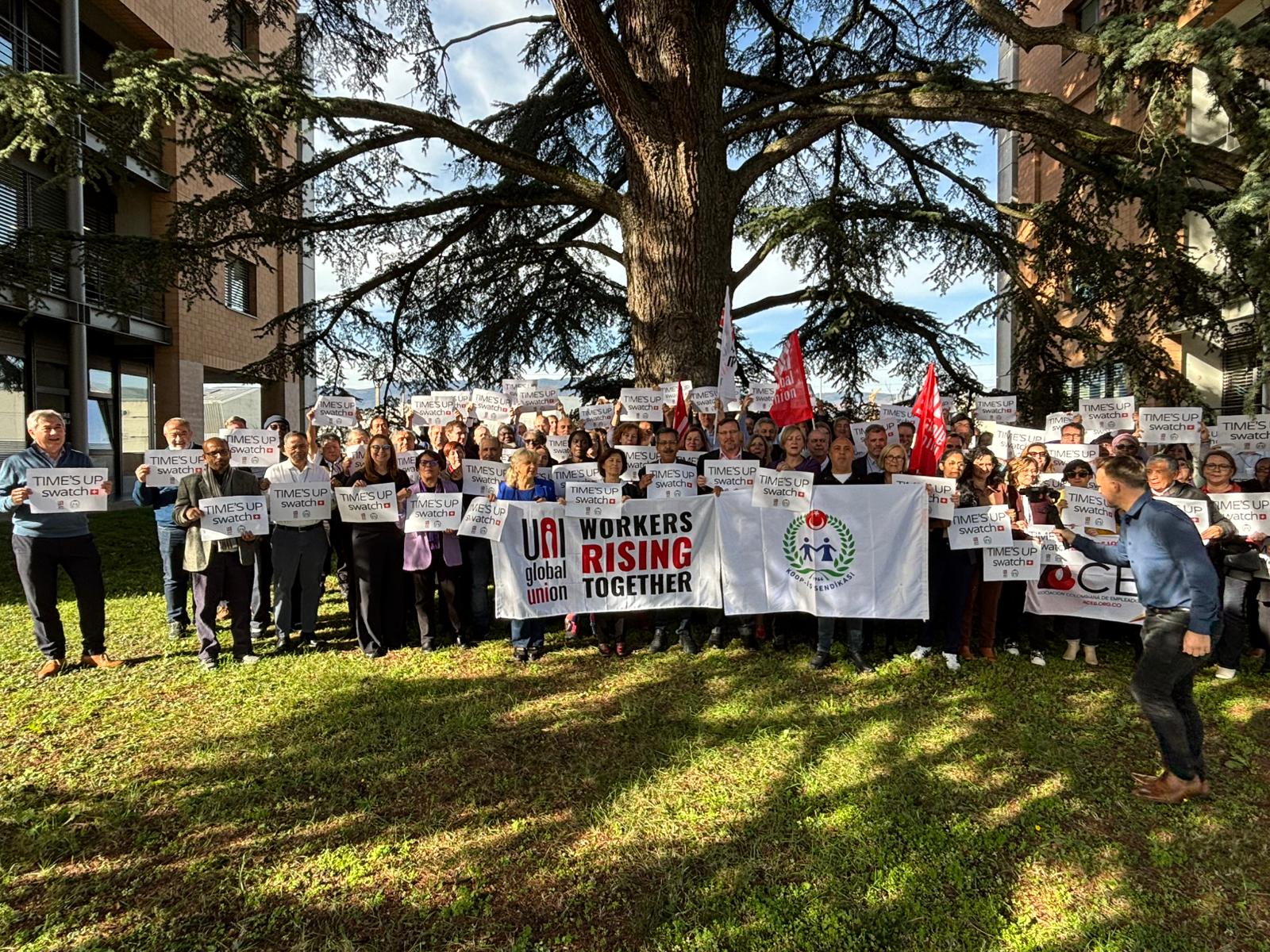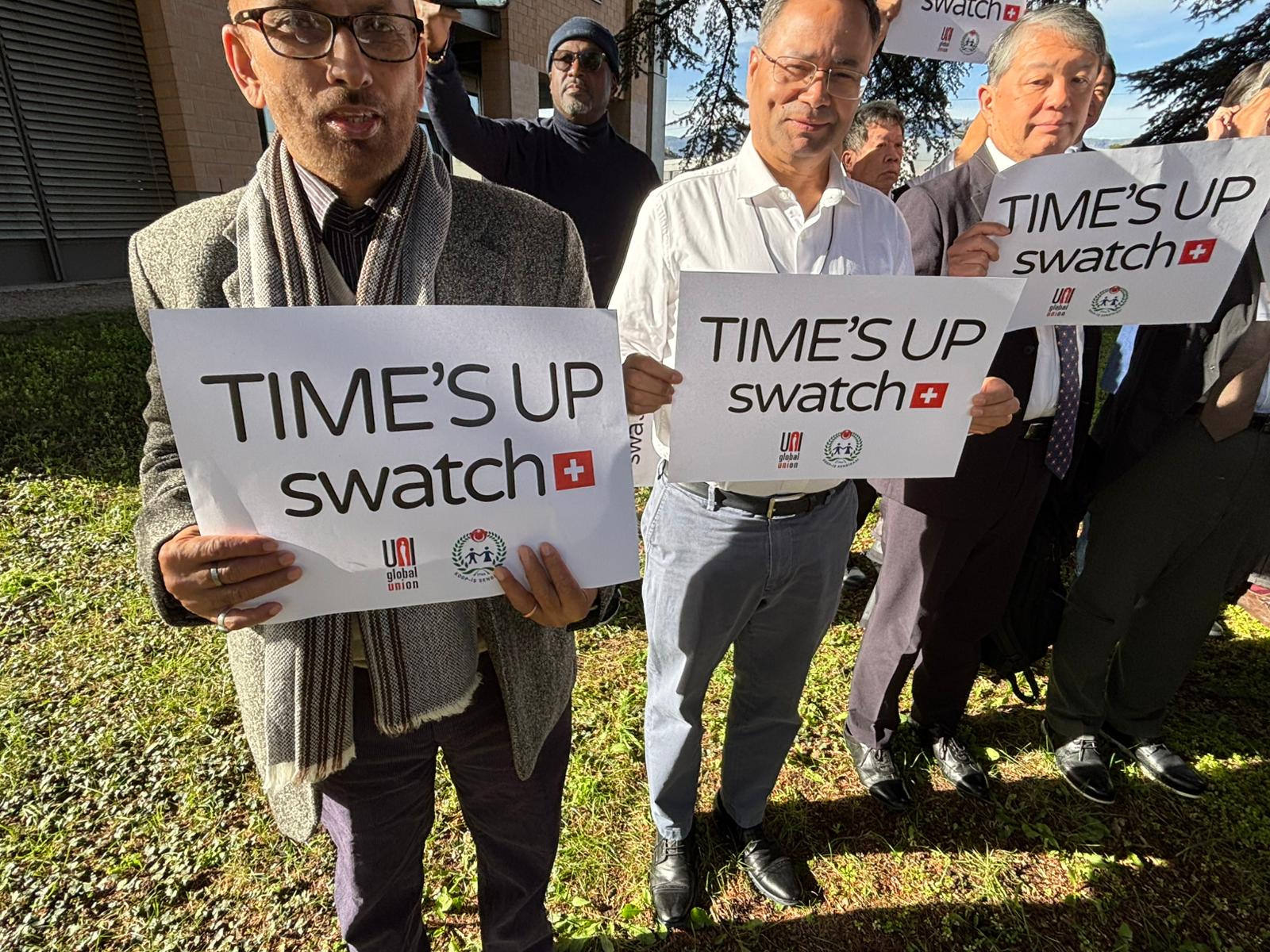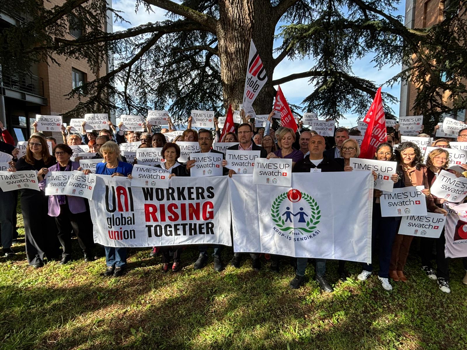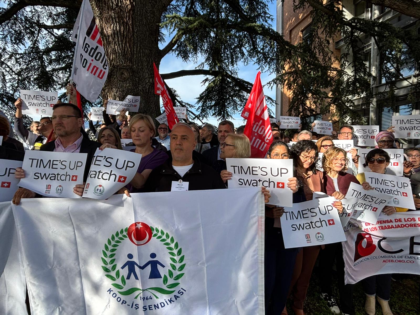 UNI Global Union’ın Cenevre’de düzenlenen toplantısında bir araya gelen ve sendikamız Koop-İş’i temsilen Genel Mali Sekreterimiz Osman Aksoy ile Dış İlişkiler Uzmanımız Murat Gerçek’in de yer aldığı farklı ülkelerden sendika yöneticileri, düzenledikleri dayanışma eyleminde “TIME’S UP SWATCH” yazılı pankartlar taşıyarak Swatch Group’a çağrıda bulundu. Uluslararası sendikacılar, Swatch’ın Türkiye’de yürütülen toplu iş sözleşmesi sürecinde çalışanların haklarını tanıması, adil bir sözleşme için yeniden masaya dönmesi ve grevdeki üyelerimize saygı göstermesi gerektiğini vurguladı.