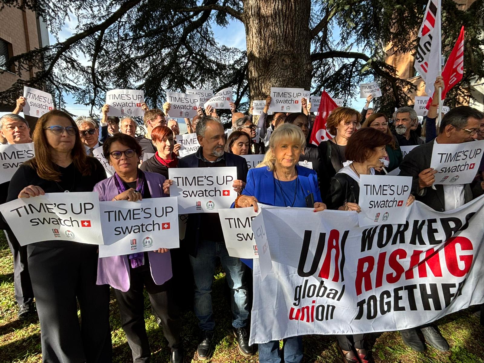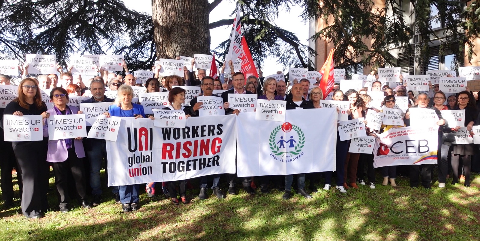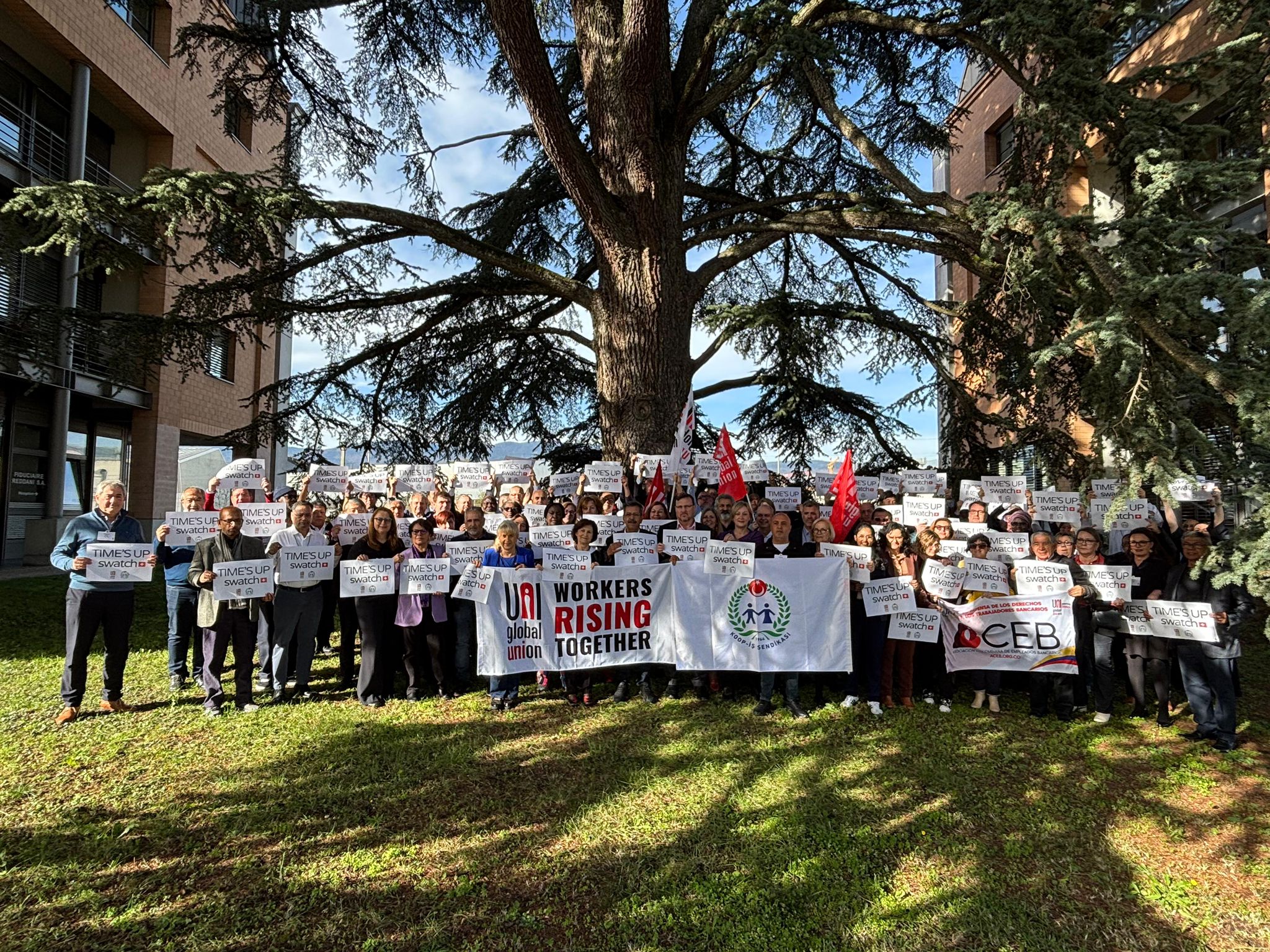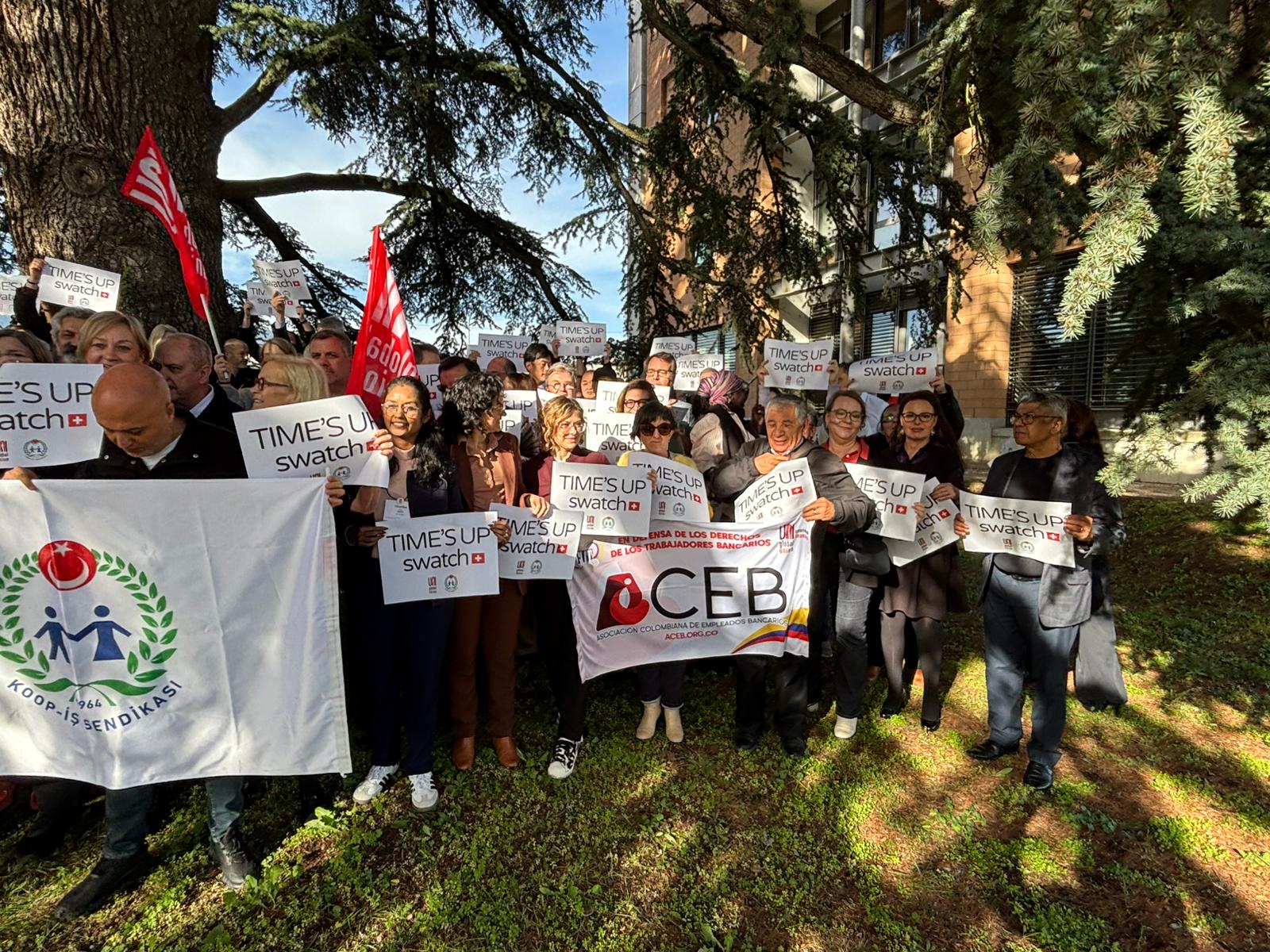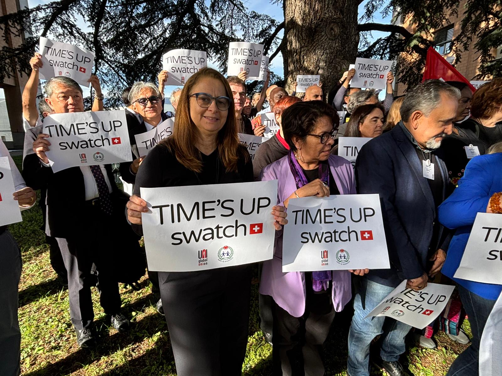 UNI Global Union’ın Cenevre’de düzenlenen toplantısında bir araya gelen ve sendikamız Koop-İş’i temsilen Genel Mali Sekreterimiz Osman Aksoy ile Dış İlişkiler Uzmanımız Murat Gerçek’in de yer aldığı farklı ülkelerden sendika yöneticileri, düzenledikleri dayanışma eyleminde “TIME’S UP SWATCH” yazılı pankartlar taşıyarak Swatch Group’a çağrıda bulundu. Uluslararası sendikacılar, Swatch’ın Türkiye’de yürütülen toplu iş sözleşmesi sürecinde çalışanların haklarını tanıması, adil bir sözleşme için yeniden masaya dönmesi ve grevdeki üyelerimize saygı göstermesi gerektiğini vurguladı.