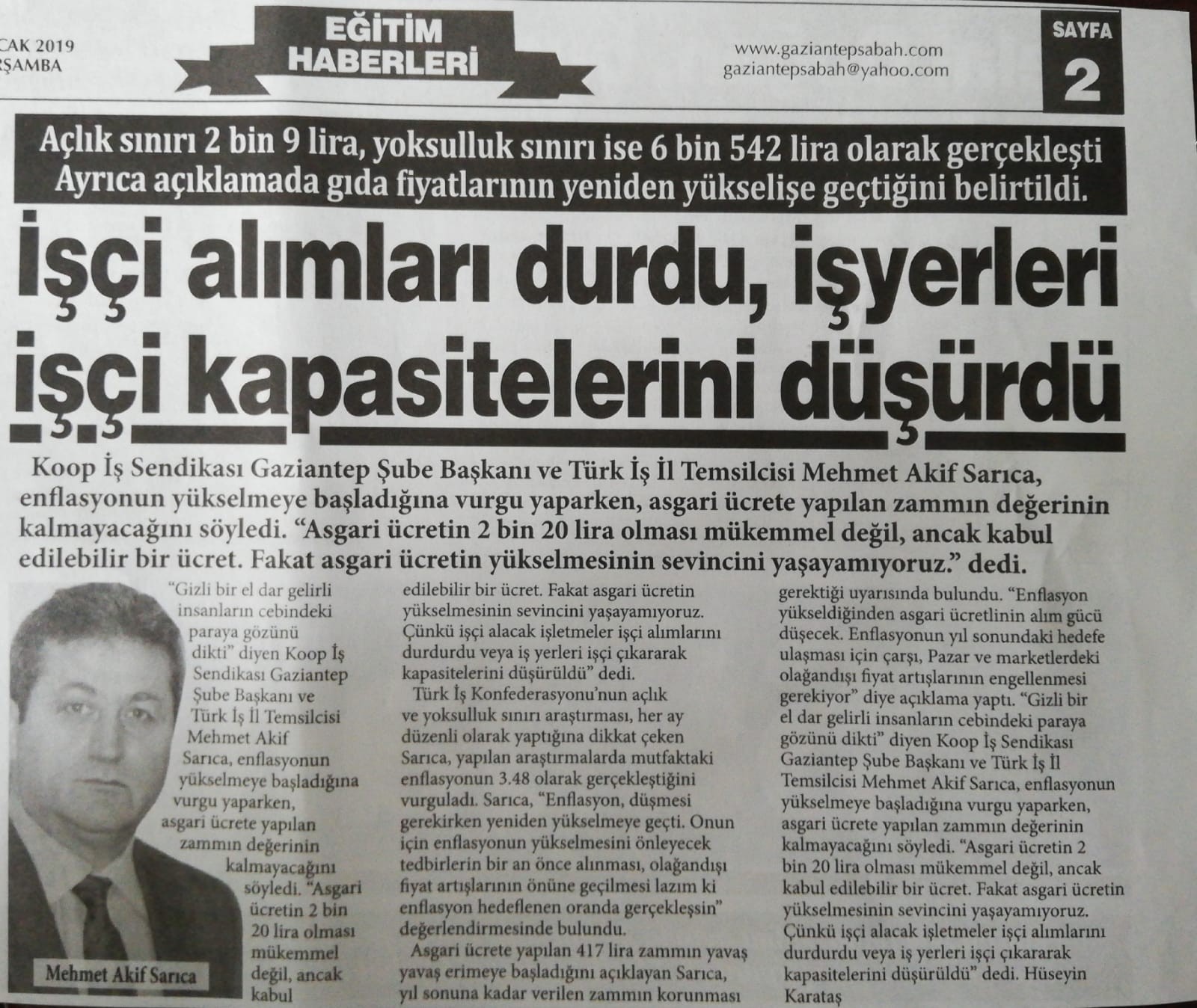 Gaziantep Sabah Gazetesi için açıklma yapan Başkan Sarıca, enflasyonun yükselmeye başladığını, asgari ücretin değerinin kalmayacağını söyledi. İşçi alımlarının durduuğuna ve iş yerlerinin işçikapasitelerini düşürdüğüne değinen Sarıca, gerekli tedbirlerin alınması gerektiğini söyledi