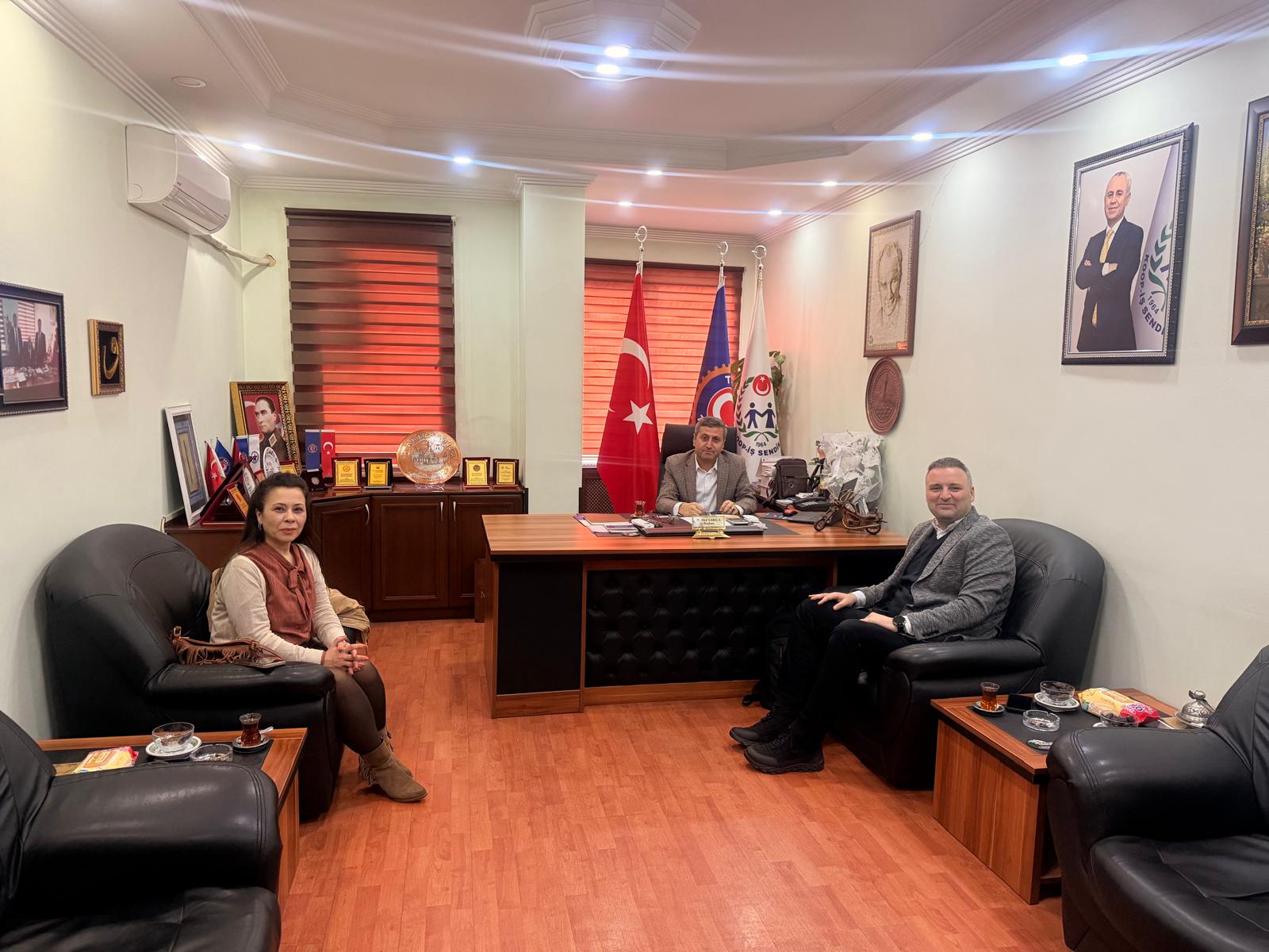 Türkiye Esnaf ve Sanatkârlar Odaları Birliğine bağlı Gaziantep GESOB Koordinatörleri Funda Üçtaş Bozo ve Mustafa Yücesoy, sendikamız Gaziantep Şube Başkanı ve Türk-İş İl Başkanı M. Akif Sarıca’yı ziyaret etti.