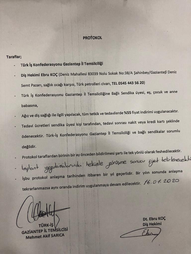 TÜRK-İŞ Gaziantep İl Temsilcisi ve Sendikamız Gaziantep Şube Başkanı Mehmet Akif Sarıca, Diş Hekimi Ebru Koç ile indirim anlaşması imzaladı.