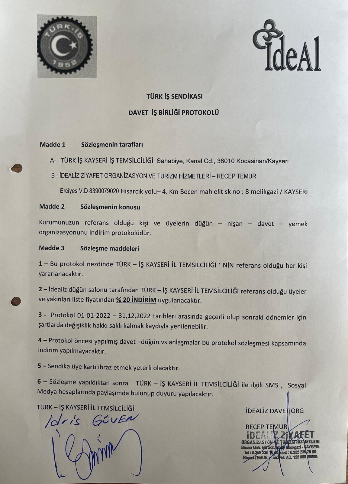 TÜRK-İŞ Kayseri İl Temsilcisi ve Sendikamız Kayseri Şube Başkanı İdris Güven, İdealiz Ziyafet Organizasyon ve Turizm Hizmetleri ile indirim anlaşması imzaladı. Anlaşmadan TÜRK-İŞ'e bağlı sendikaların üyeleri ile birinci dereceden yakınları yararlanacak.