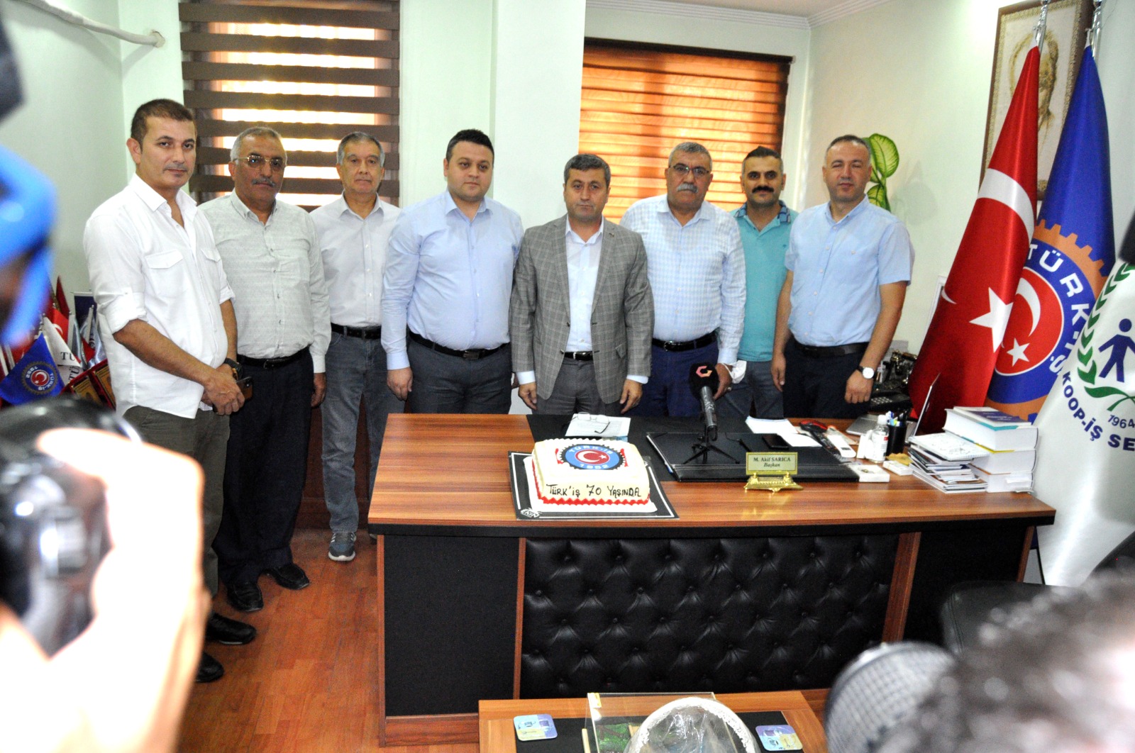 TÜRK-İŞ Gaziantep İl Temsilcisi ve Sendikamız Gaziantep Şube Başkanı M.Akif Sarıca, Konfederasyonumuz TÜRK-İŞ'in 70. yıl dönümü nedeni ile biraraya geldiği bağlı sendika şube başkanları ile birlikte kutlama düzenledi. Kutlamada konuşma yapan Başkan Sarıca, Türk Sendikacılık dünyasının çınarı Konfederasyonumuz TÜRK-İŞ'in çatısı altında olmaktan gurur, mutluluk ve güven duyduğunu belirtirken, Konfedersyonumuz TÜRK-İŞ'i kuran, bu günlere getiren tüm emekçilere şükranlarını sundu.