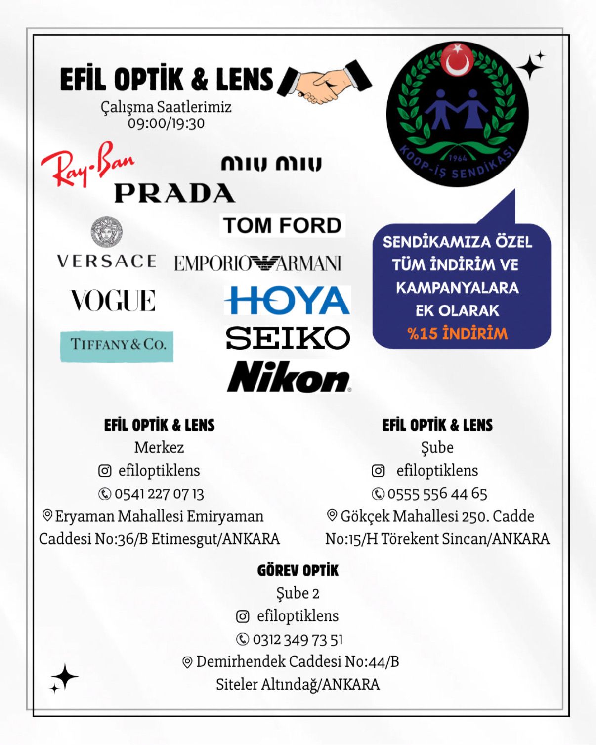 Sendikamız Ankara 1 Nolu Şube Başkanı Yücel Yıldırım, üyelerimizin ve birinci derece yakınlarının faydalanabileceği bir indirim anlaşmasını Efil Optik ile imzaladı.