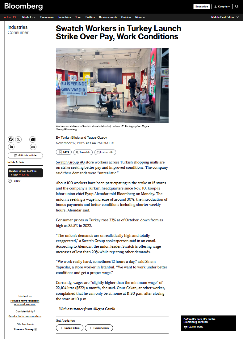Bloomberg’in haberine göre; İstanbul, Ankara ve Antalya şehirlerindeki AVM’lerde bulunan Swatch mağazalarında görev yapan yaklaşık 100 çalışanın, 10 Kasım’dan bu yana grevde olduğu belirtildi. Haberde, üyelerimizin daha iyi ücret, ek ödeme ve prim hakkı, daha insani çalışma saatleri gibi temel taleplerinin altı çizildi.
