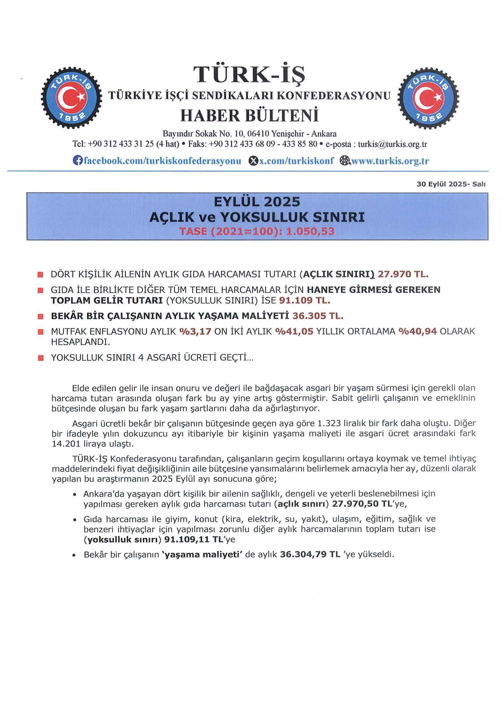 TÜRK-İŞ AÇLIK YOKSULLUK SINIRINI AÇIKLADI